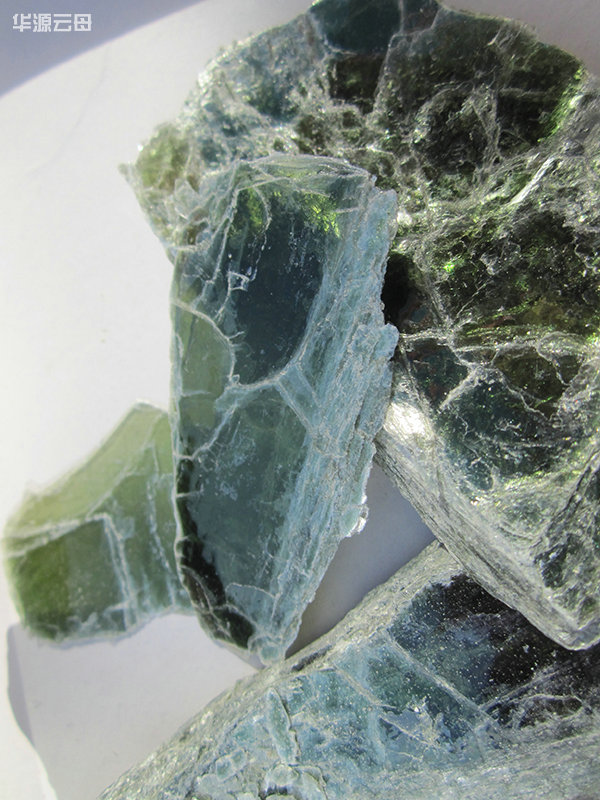 云母具有完善的解理,可以剝分。理論上白云母能剝分成10左右,。云母晶體的隱伏解理,即為打象和壓象。白云母薄片一般無色透明,但往往染有綠、棕、黃和粉紅等色調(diào);玻璃光澤,解理面呈珍珠光澤。